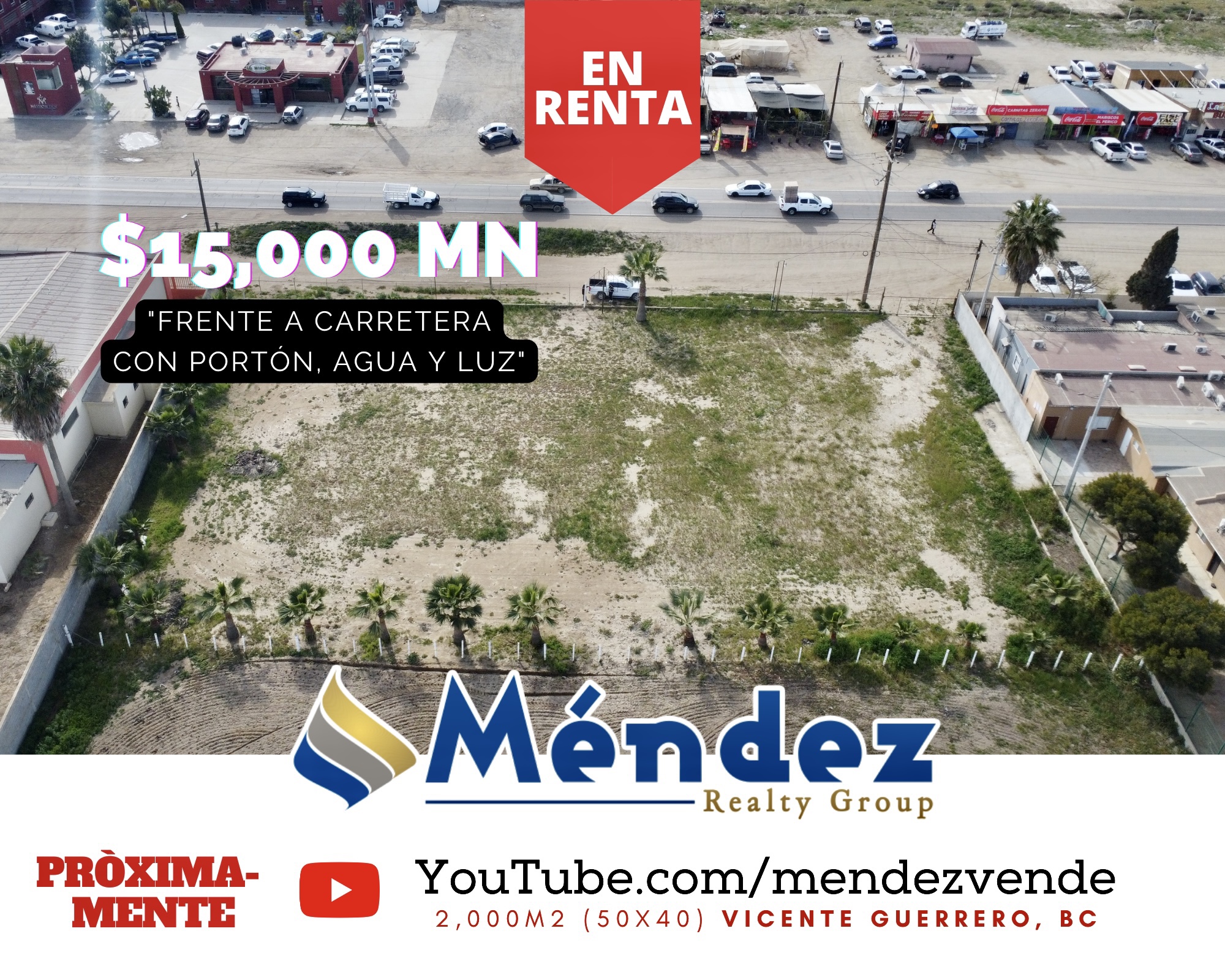 En renta terreno comercial de 2,000m2 (50×40) frente a Carretera Transpeninsular, muy céntrico, con portón y servicios de agua y luz ya contratados.