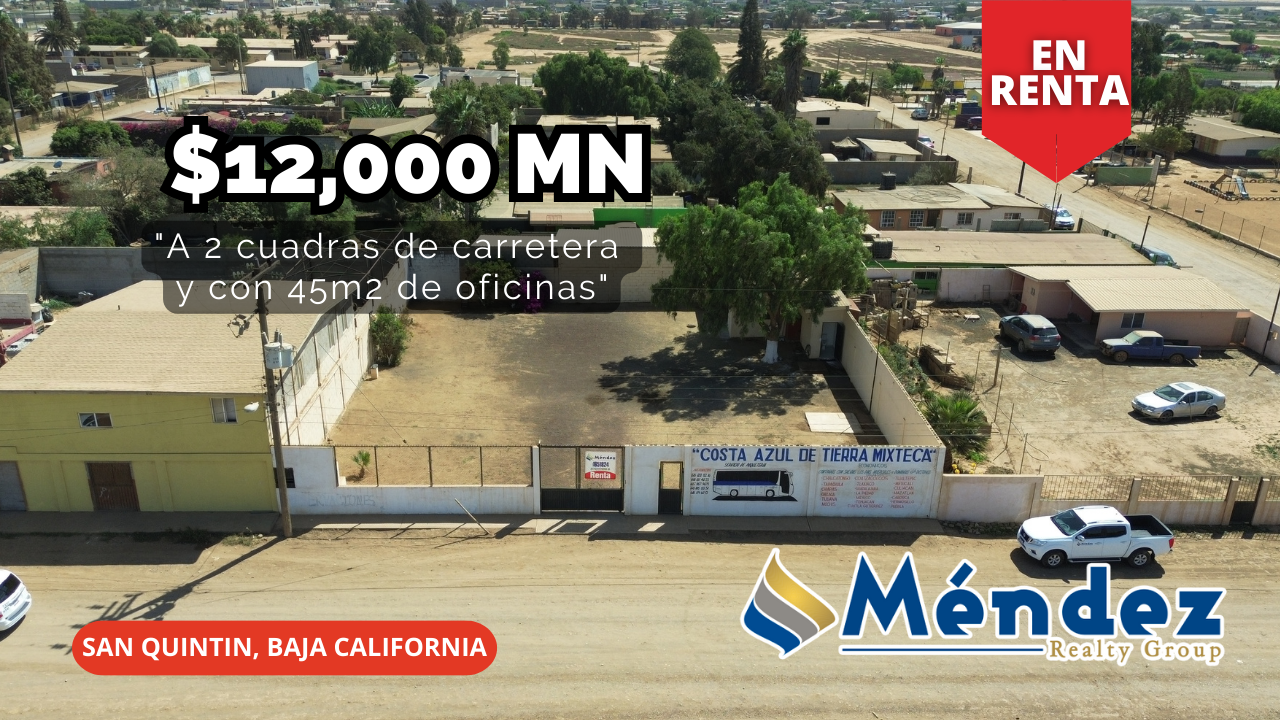 Esta propiedad en renta está muy céntrica, en buenas condiciones y en zona segura. Este terreno comercial en renta es de 764m2 (26 mts X 29 mts) esta solo a 160 mts de la Carretera Transpeninsular, totalmente bardeado, con portón de 3.3 mts de ancho, con 45 m2 oficina y 2 medios baños.