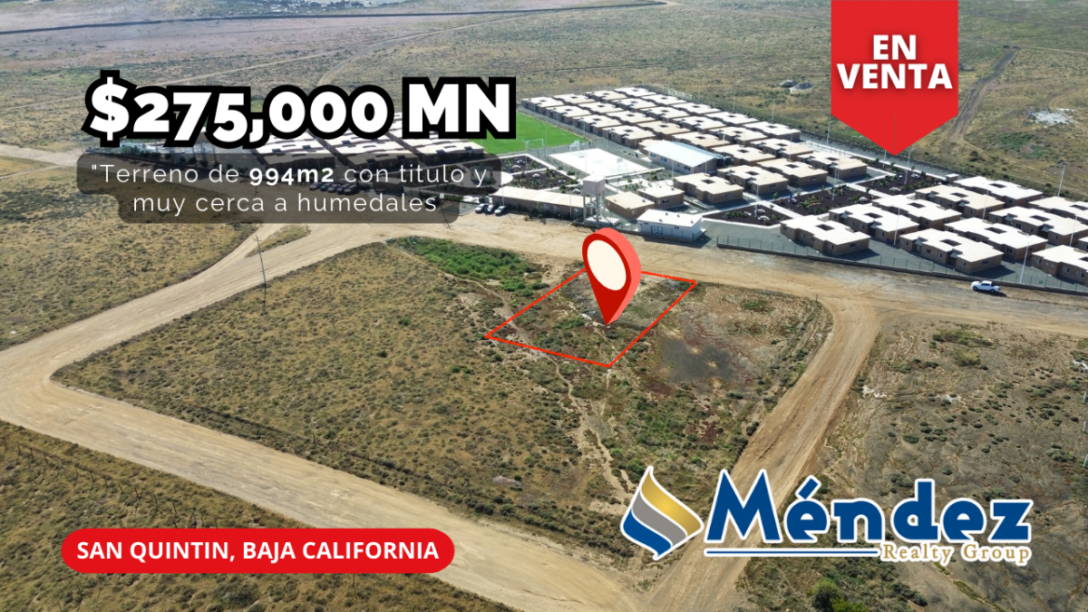 En venta terreno comercial o residencial de 994 m2 (25×40) a tan solo 850 mts de los humedales de San Quintín Baja California. Esta propiedad está frente al fraccionamiento Villas Arándano. Sin duda alguna esta propiedad se encuentra en una de las zonas de mayor interés local y nacional por su gran variedad en su biodiversidad en el área.