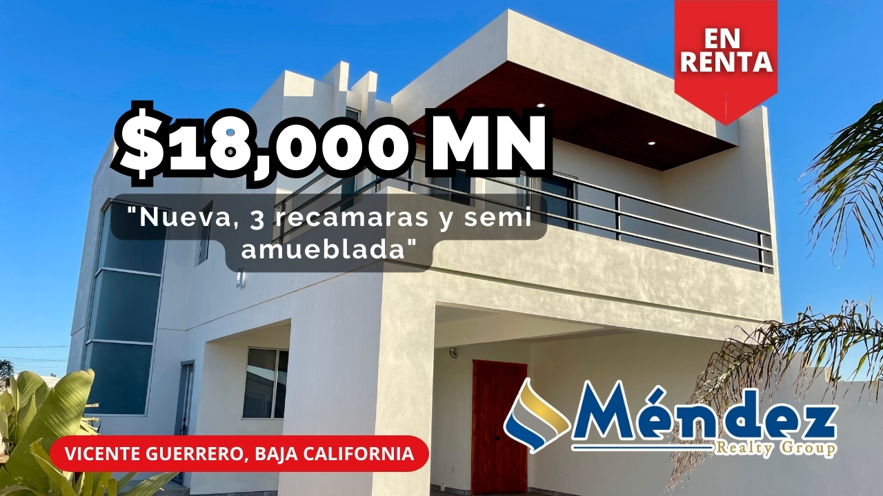 En renta casa NUEVA semi amueblada de 206m2 con dos niveles, muy céntrica y en zona segura. Esta propiedad es de 3 recámaras con sus closets cada una, 2.5 baños, sala, cocina, comedor, pisos laminados y persianas. Cuenta con estacionamiento para 3 carros y con un área de asador y balcón. Esta casa está totalmente bardeada y con portón eléctrico ubicada en una de las mejores comunidades en el Valle de San Quintín Baja California.