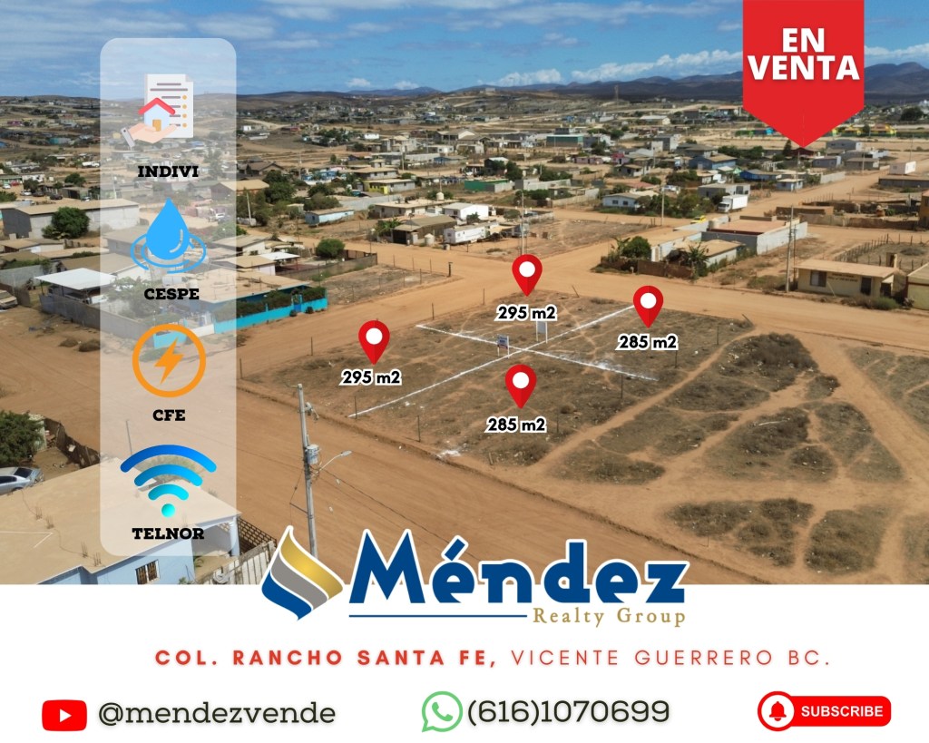 En venta 4 terrenos residenciales de 295m2 (14.5X20) titulación ya contratada ante INDIVI y los servicios de agua, luz e internet ya se pueden contratar. Estan ubicados en la Col. Rancho San Fe, Vicente Guerrero BC.